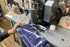 エムエムティーの自社工場では機械を使ってハトメ作業をしてるので納品がスピーディーになります。(一部のサイズのみ)